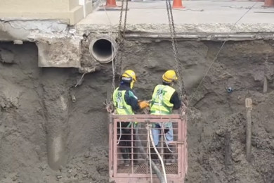 เทคนิค "Shotcrete" เสริมผนังดินใต้อาคาร สน.สามเสน ป้องกันทรุดซ้ำ ก่อนถมทรายปิดหลุมยุบ