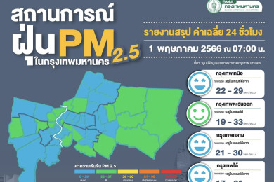 เช้านี้ ฝุ่นพิษเฉลี่ย 18.4 มคก./ลบ.ม. แนวโน้มลดลง อุณหภูมิสูงสุด 39 องศาฯ ไม่พบฝนใน กทม.