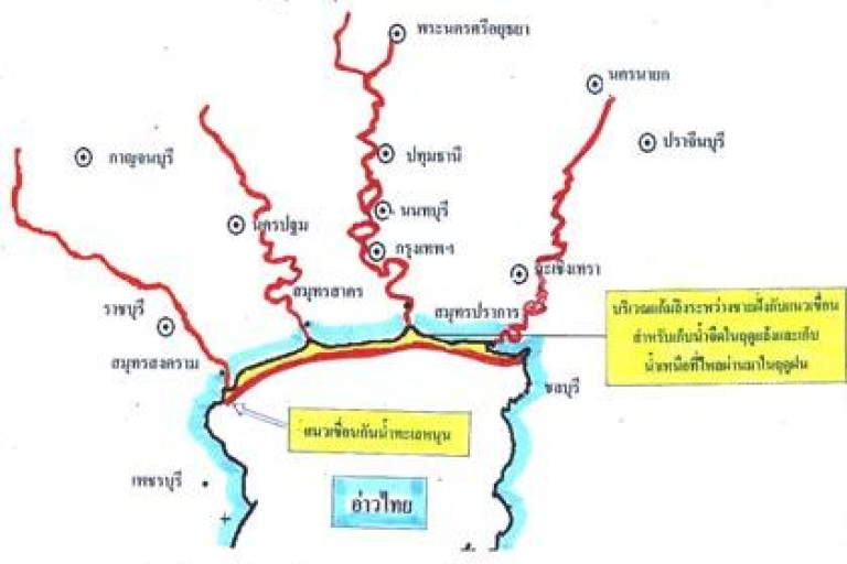 แนวคิดสร้างเขื่อนปิดก้นอ่าวไทยเริ่มในปลายยุคทักษิณ ชินวัตร ในชื่อโครงการโรแมนติกว่า “เขื่อนสามสมุทร หนึ่งนักครา สี่มหานที”กั้นปากแม่น้ำบางปะกง ข้ามก้นอ่าวไปจรดแหลมผักเบี้ย เพชรบุรีผ่าน “สามสมุทร” (ปราการ สาคร สงคราม) กรุงเทพฯ (มหา) “นัครา” “สี่มหานที” แม่น้ำบางปะกง-เจ้าพระยา-ท่าจีน-แม่กลองคล้าย Zuiderzeewerken ของเนเธอร์แลนด์ที่สร้างโดยวิศวกรอเมริกันเมื่อ 700 ปีมาแล้ว ครอบคลุมพื้นที่ประมาณ 2,000 ตารางไมล์ของไทยหากสร้างได้ จะมีพื้นที่หลังเขื่อน 1.5 ล้านไร่ ใช้งบประมาณก่อสร้างในช่วงเริ่มคิด 160,000 ล้านบาท