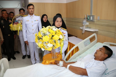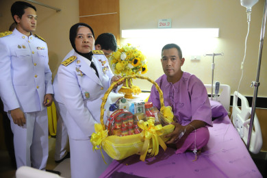 ผู้ว่าฯปัตตานี เชิญดอกไม้และตะกร้าสิ่งของพระราชทานไปมอบแก่ สมาชิกกองอาสารักษาดินแดน ชุดคุ้มครองตำบลดอนทราได้รับบาดเจ็บจากคนร้ายใช้อาวุธปืนยิงใส่