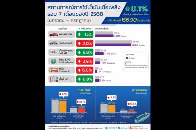 "กรมธุรกิจพลังงาน" เผยยอดใช้ "น้ำมัน" 7 เดือนแรก 2568 Jet-เบนซินพุ่ง ขณะที่ ดีเซล–LPG ลด ส่งออกทรุดกว่า 17%