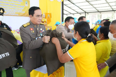 พลเอก ประยุทธ์ จันทร์โอชา องคมนตรี เชิญถุงพระราชทานไปมอบแก่ราษฎรที่ประสบวาตภัยในพื้นที่จ.อุบลราชธานี