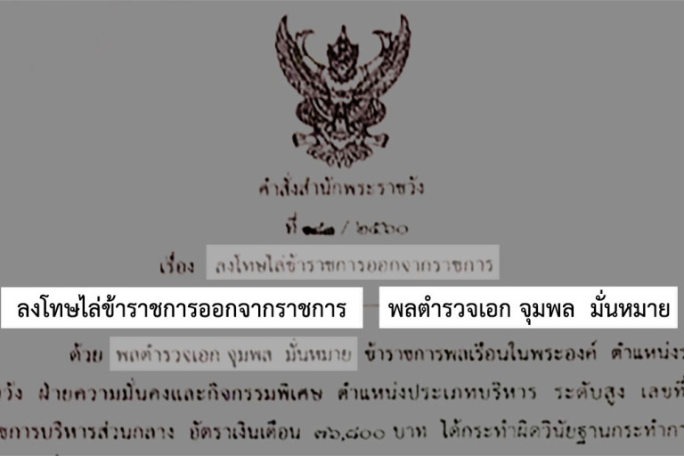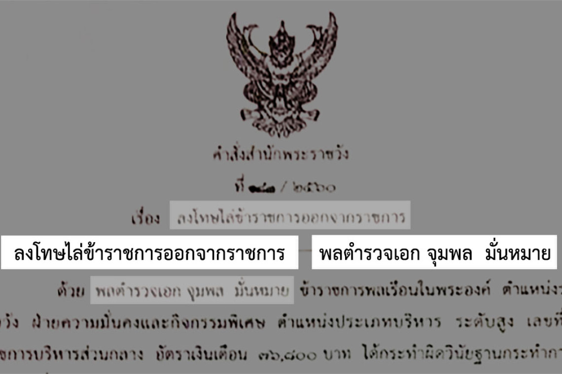 ฉะนั้น อาศัยอำนาจตามความในมาตรา 97 แห่งพระราชบัญญัติว่าด้วยระเบียบข้าราชการพลเรือน พ.ศ.2551 และ มาตรา 11 แห่งพระราชกฤษฎีกาว่าด้วยระเบียบข้าราชการพลเรือนในพระองค์ พ.ศ. 2552 ลงโทษไล่ พลตำรวจเอกจุมพล มั่นหมาย ออก จากราชการ