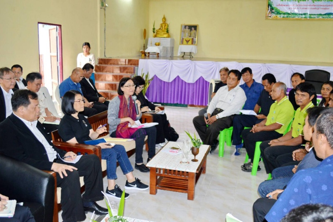 จุดที่ 1 ณ กลุ่มผู้ผลิตข้าวพันธุ์ดีบ้านกันจารย์ ต.จารพัต อ.ศีขรภูมิ จ.สุรินทร์ เกษตรกรสมัครเข้าร่วมโครงการจำนวน 4 กลุ่ม คือ ม.1 มีสมาชิก 34 ราย พื้นที่ 688 ไร่,ม.8 มีสมาชิก 68 ราย พื้นที่ 1,078 ไร่,ม.14 มีสามชิก 80 ราย พื้นที่ 1,500 ไร่ และม.15 มีสมาชิก 87 ราย มีพื้นที่ 1,088 ไร่ ในเบื้องต้นได้ทำความเข้าใจในเรื่องการทำนาแปลงใหญ่แก่สมาชิกที่สมัครเข้าร่วมโครงการ สำหรับการเพาะปลูกในปี 2560 จะเริ่มประมาณเดือนพฤษภาคม เรื่องน้ำในหมู่บ้านมีฝายชะลอน้ำแล้ว แต่ต้องการให้ขุดลอกเพิ่มเติม ให้โครงการชลประทานสุรินทร์ดำเนินการ และรองผู้ว่าราชการจังหวัดดูแลในส่วนของงบประมาณ