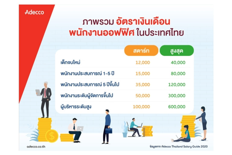 บริษัทอเด็คโก้ประเทศไทย HR Agency ผู้นำระดับโลกด้านการให้บริการทรัพยากรบุคคลแบบครบวงจร เปิดตัว Salary Guide 2020 คู่มือฐานเงินเดือนประจำปี เผยอัตราเงินเดือนในสายอาชีพต่าง ๆ กว่า 800 ตำแหน่ง จากบริษัทชั้นนำที่เป็นลูกค้าของอเด็คโก้กว่า 3,000 บริษัท โดยในปีนี้พบว่าอาชีพที่มีเงินเดือนเริ่มต้นสูงสุดได้แก่อาชีพในสาย IT ขณะที่เงินเดือนผู้บริหารเพิ่มสูงทุกสาขาสะท้อนความต้องการบุคลากรเพื่อปรับตัวธุรกิจสู่ยุคดิจิทัล (Digital Transformation)