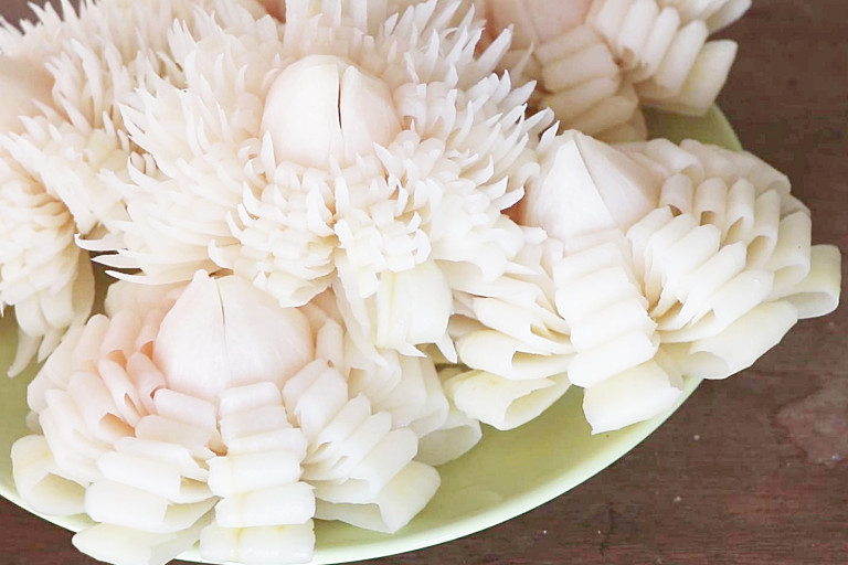 เริ่มตั้งแต่การเก็บผลจันทน์เทศต้องหาผลที่มีความสมบูรณ์ลูกใหญ่โตตามความต้องการ ไม่ให้ผลร่วงหล่นตกลงพื้น นำมาล้างให้สะอาด ดองด้วยน้ำเกลืออย่างน้อย 1 คืนเพื่อให้ยางของลูกจันทน์เทศเจอจางลง จากนั้นนำมาปลอกเปลือกโดยคำนึงถึงให้ผลกลมเนื้อเรียบเพื่อง่ายต่อการแกะสลัก จากนั้นแช่น้ำเกลือไว้อีกอย่างน้อย2-4 ชั่วโมงก่อนจะใช้ฝีมือในการแกะสลักขึ้นดอก ส่วนใหญ่ชาวถ้ำน้ำผุดจะแกะสลักเป็นดอกพิกุลและดอกบัวเนื่องจากความสวยงามของผลที่แกะสลักออกมาแล้วให้ความสวยงามและโดดเด่นเป็นอย่างยิ่ง