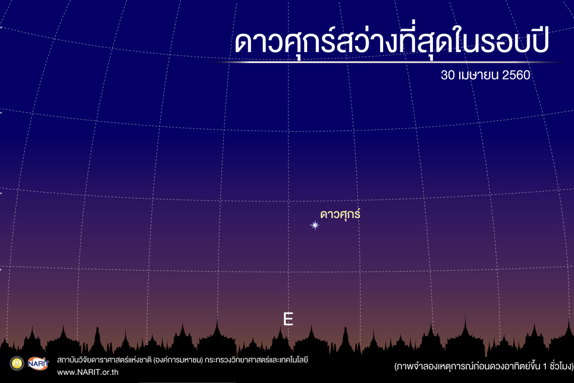 ดร.ศรัณย์ โปษยะจินดา รองผู้อำนวยการ สดร. เปิดเผยว่า “ในช่วงเช้ามืดของวันที่ 30 เมษายน 2560 เวลาประมาณ 04:00-06:00 น. ก่อนดวงอาทิตย์ขึ้น ดาวศุกร์จะปรากฏสว่างที่สุดครั้งสุดท้ายในรอบปี สามารถสังเกตได้ด้วยตาเปล่าอย่างชัดเจน ในทุกภูมิภาคของประเทศ คาดว่าจะมีความสว่างปรากฏถึงแมกนิจูด -4.6 (ระดับความส่องสว่างปรากฏของดวงจันทร์เต็มดวง แมกนิจูด -12.6) หากสังเกตผ่านกล้องโทรทรรศน์ดาวศุกร์จะปรากฏเป็นเสี้ยวคล้ายดวงจันทร์”