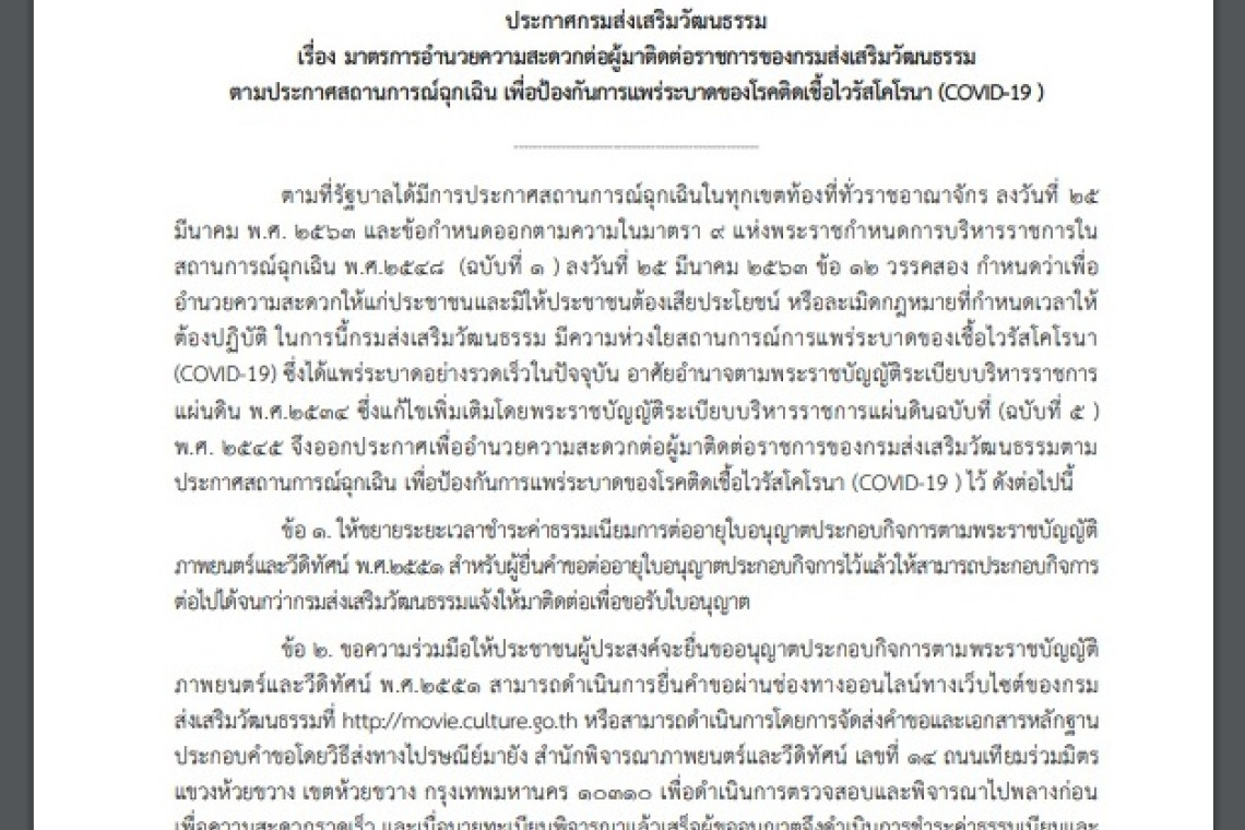 นายชาย นครชัย อธิบดีกรมส่งเสริมวัฒนธรรม กล่าวว่า กรมส่งเสริมวัฒนธรรม (สวธ.) มีความห่วงใยในสถานการณ์การแพร่ระบาดของเชื้อไวรัสโคโรนา(Covid -19) ที่กำลังแพร่ระบาดอย่างรวดเร็วในขณะนี้ จึงอาศัยอำนาจตามพระราชบัญญัติระเบียบบริหารราชการแผ่นดิน พ.ศ.2534 ซึ่งแก้ไขเพิ่มเติมโดยพระราชบัญญัติระเบียบบริหารราชการแผ่นดิน (ฉบับที่ 5) พ.ศ.2545 ได้ออกประกาศเพื่ออำนวยความสะดวกต่อผู้มาติดต่อราชการของสวธ. ตามประกาศสถานการณ์ฉุกเฉิน เพื่อป้องกันการแพร่ระบาดของโรคติดเชื้อไวรัสโคโรนา (Covid-19) ได้แก่