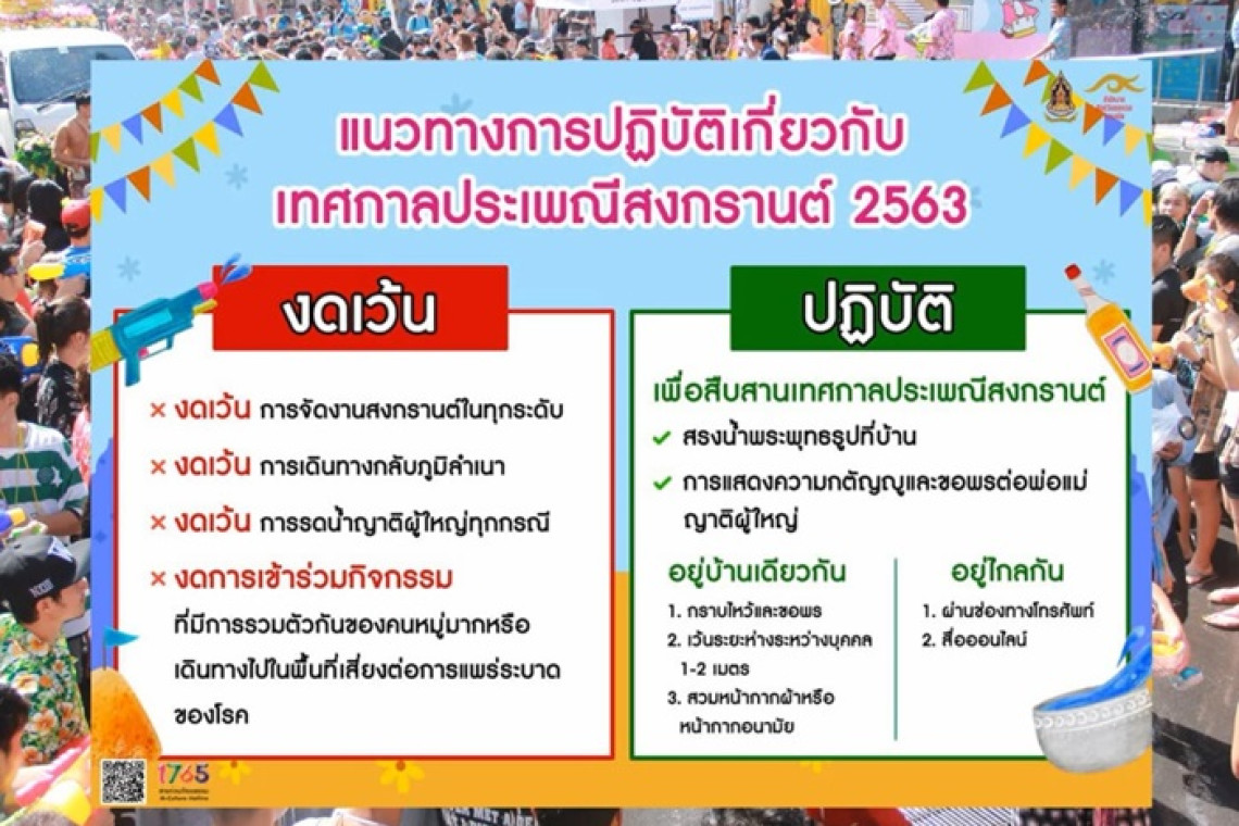 13 เมษายน 2563 08:34 น. สยามรัฐออนไลน์ วัฒนธรรม ช่วงแพร่ระบาดเชื้อไวรัสโควิด-19 ภาครัฐได้ออกข้อ “งดเว้น” และ “สืบสาน” แนวทางการปฏิบัติเทศกาลประเพณีสงกรานต์ 2563 ตามคำอธิบายรูปภาพอินโฟกราฟิกกระทรวงวัฒนธรรม นี้เลยค่ะ
