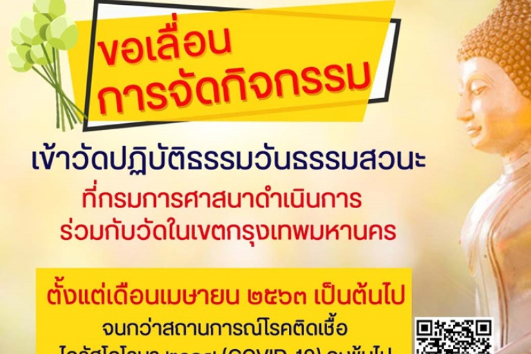 นายกิตติพันธ์ พานสุวรรณ อธิบดีกรมการศาสนา (ศน.) กล่าวว่า เนื่องจากในสถานการณ์ปัจจุบันมีการระบาดของโรคติดเชื้อไวรัสโคโรนา 2019 (COVID 19) ทำให้มีผู้ติดเชื้อในประเทศไทยเป็นจำนวนเพิ่มสูงขึ้น เพื่อเป็นการป้องกันและควบคุมมิให้มีการแพร่ระบาดของโรคดังกล่าว ศน.จึงเห็นควรที่จะงดการจัดกิจกรรมเข้าวัดปฏิบัติธรรมวันธรรมสวนะ (วันพระ) ในเขตกรุงเทพมหานคร ที่ได้ดำเนินการร่วมกับหน่วยงานเครือข่ายเป็นประจำทุกเดือน เพื่อไม่ให้เกิดการรวมตัวกันของคนเป็นจำนวนมาก ลดความเสี่ยงในการติดเชื้อดังกล่าว ตั้งแต่เดือนเมษายน 2563 เป็นต้นไป จนกว่าสถานการณ์โรคติดเชื้อไวรัสโคโรนา 2019 (COVID 19) จะพ้นไปหรืออาจมีการปรับรูปแบบการดำเนินกิจกรรมเมื่อสถานการณ์เอื้ออำนวย