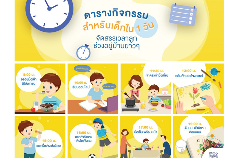 ทั้งหมดนี้เป็นเพียงส่วนหนึ่งของไอเดียในการจัดตารางกิจกรรมประจำวันให้เด็ก ๆ คุณพ่อคุณแม่อาจเลือกปรับให้เหมาะสมกับครอบครัวและความสนใจของลูก โดยข้อดีของการมีตารางกิจกรรมประจำวันที่มีพื้นฐานตามหลัก 3 อ. คือ อาหาร ออกกำลังกาย และอารมณ์เป็นตัวช่วยในช่วงเวลาที่เด็ก ๆ ต้องอยู่บ้านนาน ๆ เช่นนี้ นอกจากจะช่วยให้เด็ก ๆ มีวินัยในการเรียนและการทำกิจกรรมให้สำเร็จตามเป้าหมายที่วางแผนไว้ทุกวัน ยังส่งผลดีต่อพัฒนาการทั้งด้านร่างกายและจิตใจอีกด้วย .. ติดตามบทความดีๆ เพิ่มเติม เพื่อสร้างสุขภาพดีที่บ้าน ได้ที่ https://www.nestle.co.th/th/nhw/health-care-during-outbreak