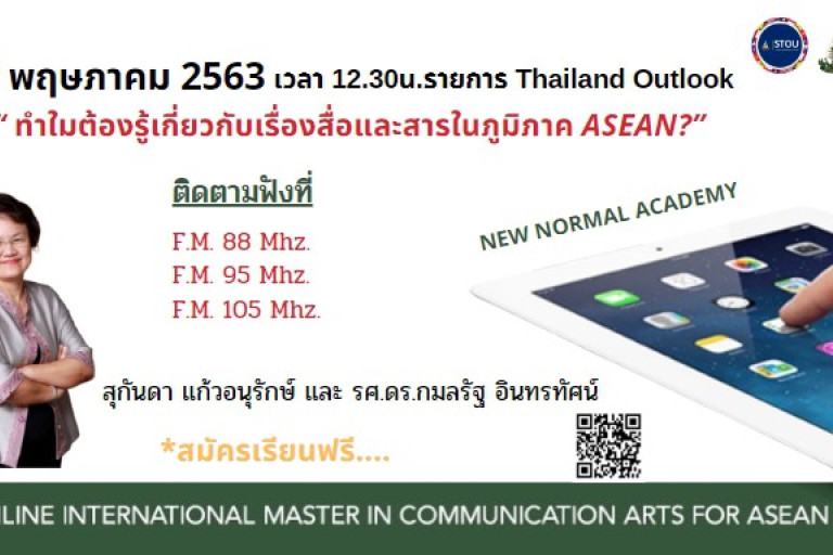 26 พฤษภาคม 2563 13:04 น. สยามรัฐออนไลน์ ไม่แสดง ทำไมต้องรู้เกี่ยวกับเรื่องและสารในภูมิภาค ASEAN? หาคำตอบได้ใน รายการ Thailand Outlook สาระความรู้รอบตัว ทาง FM. 88 Mhz . FM. 95 Mhz.และFM.105 Mhz. โดย สุกันดา แก้วอนุรักษ์ และ รศ.ดร.กมลรัฐ อินทรทัศน์ งานนี้สมัครเรียนฟรีไม่มีค่าใช้จ่าย