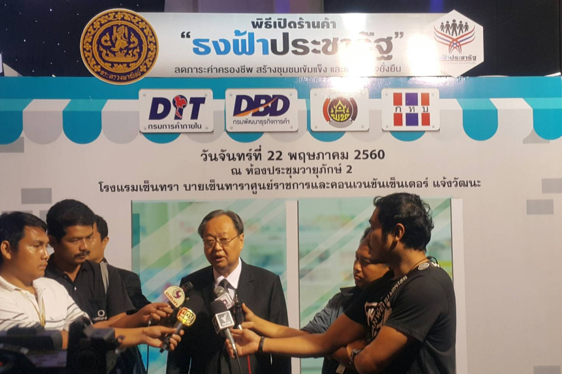 กระทรวงพาณิชย์ โดยกรมการค้าภายใน จึงได้ดำเนินโครงการ“ธงฟ้าประชารัฐ” ร่วมกับกรมพัฒนาธุรกิจการค้า กรมการพัฒนาชุมชน สำนักงานกองทุนหมู่บ้านและชุมชนเมืองแห่งชาติ ผู้ผลิตสินค้าอุปโภคบริโภครายใหญ่ 5 บริษัท ได้แก่ บริษัท สหพัฒนพิบูล จำกัด (มหาชน) บริษัท ยูนิลีเวอร์ ไทยเทรดดิ้ง จำกัด บริษัท คอลเกต-ปาล์มโอลีฟ (ประเทศไทย) จำกัด บริษัท พรอคเตอร์ แอนด์ แกมเบิล เทรดดิ้ง (ประเทศไทย) จำกัด และบริษัท เบอร์ลี่ ยุคเกอร์ จำกัด (มหาชน) ซึ่งมีการทำบันทึกข้อตกลงความร่วมมือ (MOU) โดยมีสินค้าเข้าร่วมโครงการฯ ในเบื้องต้น จำนวน 18 สินค้า 48 รายการ เช่น สบู่ ยาสีฟัน ผงซักฟอก แชมพู กระดาษชำระ บะหมี่กึ่งสำเร็จรูป ปลากระป๋อง เป็นต้น โดยกำหนดเป้าหมายในระยะแรกประมาณ 6,500 แห่ง ซึ่งการดำเนินการในระยะที่ผ่านมา ผู้ผลิตสินค้าอุปโภคบริโภคทั้ง 5 รายได้มีการติดต่อร้านค้าปลีก และมีผู้เข้าร่วมโครงการแล้ว ประมาณ 700 แห่งทั่วประเทศ