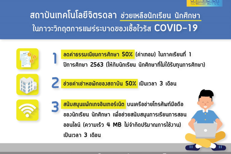 รศ.ดร.คุณหญิงสุมณฑา พรหมบุญ อธิการบดี สถาบันเทคโนโลยีจิตรลดา กล่าวว่า สถาบันได้ออกมาตรการในการช่วยเหลือนักเรียน นักศึกษาในภาวะวิกฤติโควิด 19 มี 3 มาตรการ คือ มาตรการการลดค่าธรรมเนียมการศึกษา 50% (ค่าเทอม) ในภาคเรียนที่ 1 ปีการศึกษา 2563 (สำหรับนักเรียนนักศึกษาที่ไม่ได้รับทุนการศึกษา) มาตรการที่สองการช่วยค่าเช่าหอพักของสถาบัน 50% ระยะเวลา 3 เดือน และมาตรการที่สามสนับสนุนแพ็กเกจอินเทอร์เน็ตในเครือข่ายโทรศัพท์มือถือของนักเรียน นักศึกษา เพื่อสนับสนุนการเรียนการสอนออนไลน์ ความเร็ว 4 MB ไม่จำกัดปริมาณการใช้งาน ระยะเวลา 3 เดือน โดยทั้ง 3 มาตรการเป็นนโยบายที่จะช่วยเหลือ สนับสนุน และอำนวยความสะดวกด้านการเรียนการสอนให้กับนักเรียน นักศึกษาสถาบันเทคโนโลยีจิตรลดา