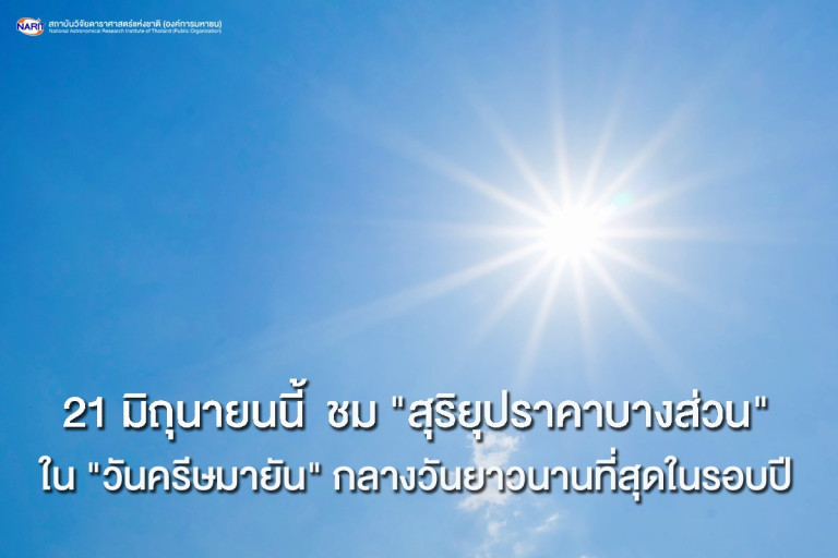 NARIT สถาบันวิจัยดาราศาสตร์แห่งชาติ โพสต์เฟซบุ๊กระบุ “21 มิถุนายนนี้ ชม #สุริยุปราคาบางส่วน ใน #วันครีษมายัน กลางวันยาวนานที่สุดในรอบปี