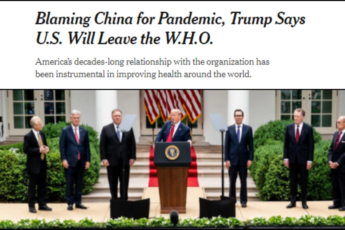 เมื่อวันที่ 29 พฤษภาคม หลังจากทรัมป์ประกาศในโรสการ์เด้น สำนักข่าวเดอะนิวยอร์กไทมส์ได้โพสต์บทความเพื่อวิจารณ์ทรัมป์อย่างรุนแรงที่กล่าวหาว่าองค์การอนามัยโลกนั้นช่วยให้จีนปกปิดการแพร่ระบาดของโรคโคโรน่าไวรัสในระยะแรก เนื่องจากไม่เป็นความจริง และไม่มีเหตุผลใดที่จะยุติความสัมพันธ์อันยาวนานนับทศวรรษของอเมริกาในช่วงเวลาวิกฤติ
