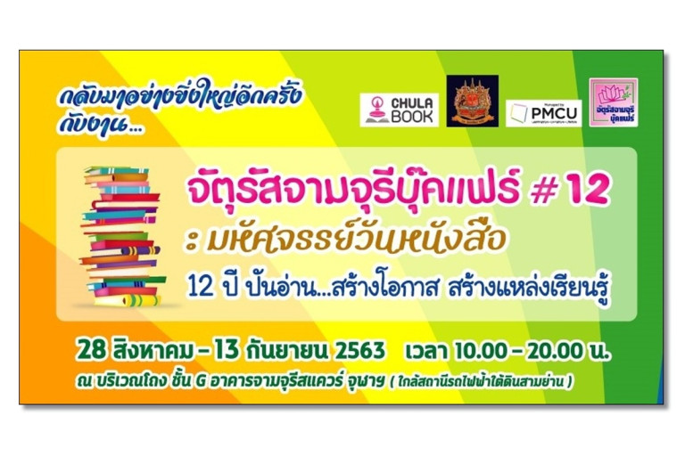 พบกับงานจัตุรัสจามจุรีบุ๊คแฟร์ ครั้งที่ 12 : มหัศจรรย์วันหนังสือ จัดขึ้นระหว่างวันที่ 28 สิงหาคม ถึง 13 กันยายน 2563 เวลา 10.00 – 20.00 น. ณ โถงชั้น G อาคารจามจุรีสแควร์ จุฬาลงกรณ์มหาวิทยาลัย (สถานีรถไฟฟ้าใต้ดินสามย่าน)