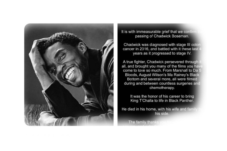 สำนักข่าวต่างประเทศรายงานว่านักแสดงชายชื่อดัง "แชดวิก โบสแมน (Chadwick Boseman)" ได้เสียชีวิตแล้วในวัย 42 ปี ด้วยโรคมะเร็งลำไส้ใหญ่ โดยแหล่งข่าววงในเปิดเผยว่า หนุ่มแชดวิก ได้รับการตรวจและพบว่าเป็นมะเร็งลำไส้ใหญ่มาตั้งแต่ปี 2016 และต่อสู้กับมันมาตลอด 4 ปี จนเสียชีวิตในที่สุด