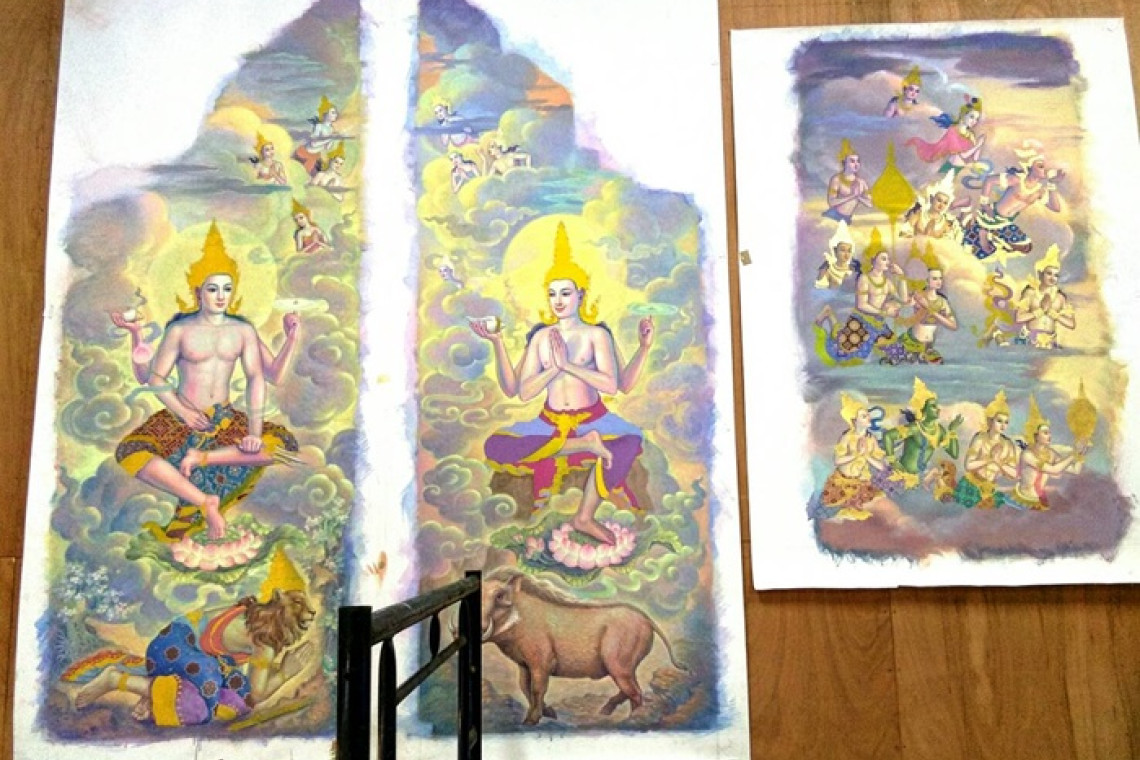 “จิตรกรชำนาญการพิเศษ”สำนักช่างสิบหมู่เผยลงสีภาพนารายณ์อวตารฉากบังเพลิงด้านทิศตะวันออก 2 ปาง ทิศตะวันตก 2 ปางเสร็จแล้ว