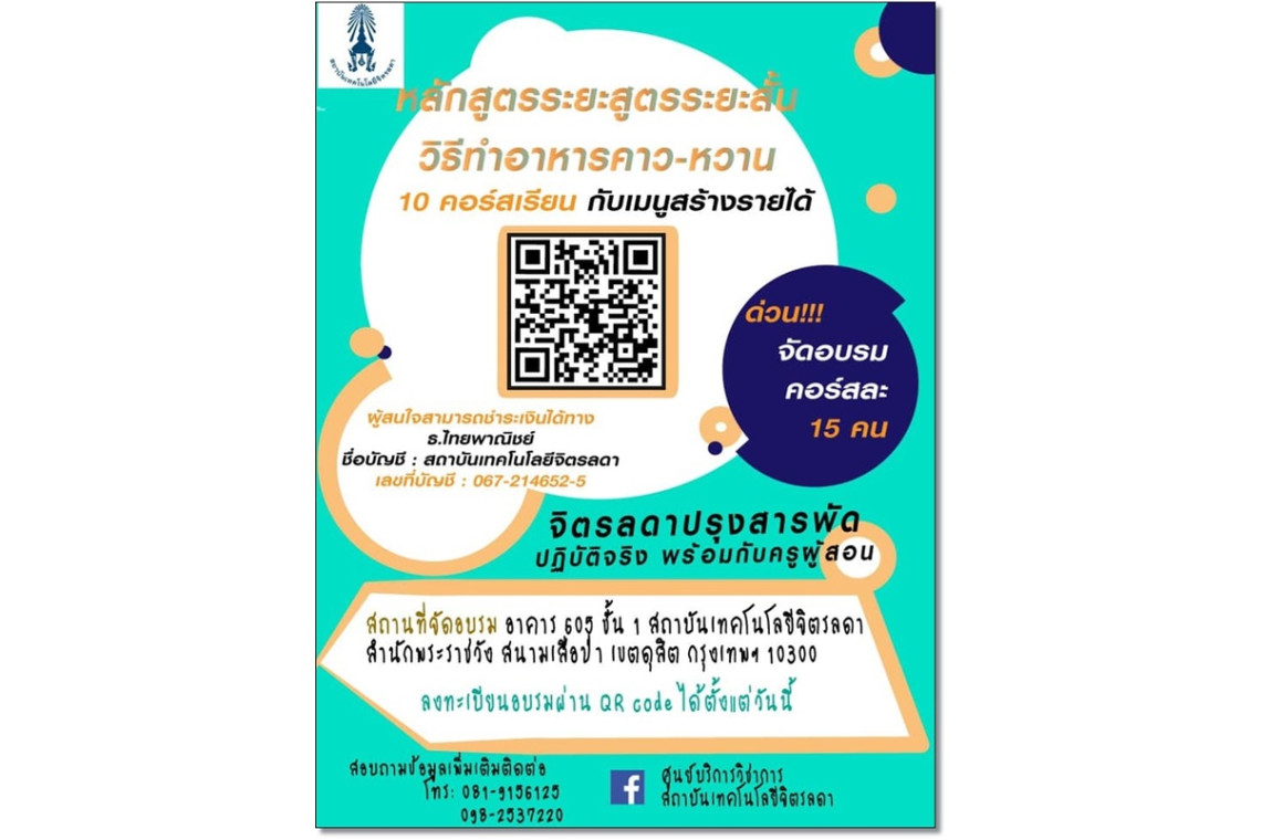 ศูนย์บริการวิชาการ สถาบันเทคโนโลยีจิตรลดา เปิดหลักสูตรอบรมอาหารระยะสั้นวิธีทำอาหารคาว-หวาน 10 หลักสูตร (เสียค่าใช้จ่าย) อาทิ คอร์สเสี่ยวหลงเปา เผือกทอด คอร์สอาหารจานเดียว คอร์สขนมจีนน้ำพริก ขนมจีนน้ำยา คอร์สขนมเปี๊ยะไส้ลาวา คอร์สผัดไท หอยทอด ออส่วน เป็นต้น เปิดรับสมัครตั้งแต่วันนี้เป็นต้นไป .. ผู้ที่สนใจสามารถลงทะเบียนผ่าน QR Code หรือสอบถามข้อมูลได้ที่หมายเลข 081-9156125, 098-2537220 และเพจศูนย์บริการวิชาการ สถาบันเทคโนโลยีจิตรลดา ด่วนรับจำนวนจำกัด