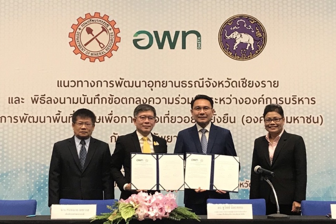 ดร. ชูวิทย์ มิตรชอบ รักษาการแทนผู้อำนวยการองค์การบริหารการพัฒนาพื้นที่พิเศษเพื่อการท่องเที่ยวอย่างยั่งยืน (อพท.) กล่าวว่า ได้ร่วมมือกับกระทรวงทรัพยากรธรรมชาติและสิ่งแวดล้อม โดย กรมทรัพยากรธรณีและ อพท. ลงนามบันทึกข้อตกลงความร่วมมือ (MOU) ทางวิชาการขับเคลื่อนอุทยานธรณีจังหวัดเชียงราย ขึ้นสู่อุทยานธรณีระดับโลก โดยได้ร่วมกันศึกษาแนวทางความเป็นไปได้ในการจัดทำแผนการพัฒนาให้เป็นแหล่งท่องเที่ยวอุทยานธรณี หรือ Geopark ตามแนวทางนโยบายของ นายกรัฐมนตรี พลเอกประยุทธ์ จันทร์โอชา ซึ่งจะดำเนินการควบคู่ไปกับการศึกษาและจัดทำแผนยุทธศาสตร์การพัฒนาเพื่อเตรียมประกาศเป็นพื้นที่พิเศษของ อพท. และผลักดันให้เชียงรายเข้าสู่เครือข่ายเมืองสร้างสรรค์ของยูเนสโก (UNESCO Creative Cities Network - UCCN)