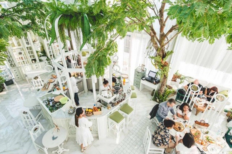 ขณะที่ อาหารหวานสุดอลังการมีทุกสิ่งให้เลือกสรร ตั้งแต่ ฮันนี่โทสต์ แพนเค้ก บาน็อฟฟี่พาย พานาคอตตา ไปจนถึง Whole Apple Crumble แอปเปิ้ลครัมเบิลที่นำแอปเปิ้ลทั้งผลเข้าไปอบพร้อมกับซินนามอน และขนมตระกูล Crepes เครปไส้ต่าง ๆ กล้วย สตรอว์เบอร์รี ช็อคโกแลต เลมอนเคิร์ด เป็นต้น นอกจากนั้นยังมีการนำอาหารหวานมาจับคู่กับค็อกเทลให้เลือกอร่อยแบบมาเป็นเซ็ต หรือจะเป็นเซ็ต All Day High Tea ที่เหมาะกับการมาสนทนากับมิตรสหายยามบ่ายสบาย ๆ ปิดท้ายด้วยเครื่องดื่มหลากหลาย มีทั้งที่ปรุงจากกาแฟ เช่น Yuzu Soda Espresso เอสเปรสโซผสมส้มยูสุและโซดาเปรี้ยวซ่า Peach Americano หอมกรุ่นกาแฟผสมพีช และอื่น ๆ อีกมากมาย ที่ขาดไม่ได้ คือ ชาสูตรของทางร้าน เช่น Into The Woods เป็นชาที่มีส่วนผสมของมะลิ กุหลาบ ใบไผ่ คอร์นฟลาวเวอร์ Memoirs of Sunrise เป็นชาไร้คาเฟอีน ผสมกับผลไม้อบแห้งจำพวก แอปเปิ้ล ส้ม พีช กระเจี๊ยบและตะไคร้ เป็นต้น. สร้างความสดชื่นสดใสหลังมื้ออาหารสุขภาพ