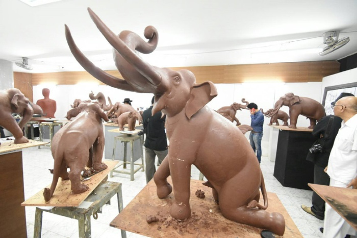 ความคืบหน้าจัดสร้างประติมากรรมช้าง 10 ตระกูล 30 ตัว ดำเนินการโดยประติมากรรมไทย ภาควิชาศิลปะประจำชาติ มหาวิทยาลัยเทคโนโลยีราชมงคลรัตนโกสินทร์ วิทยาเขตเพาะช่าง เพื่อนำไปประดับสระอโนดาตรอบพระเมรุมาศ งานพระราชพิธีถวายพระเพลิงพระบรมศพพระบาทสมเด็จพระปรมินทรมหาภูมิพลอดุลยเดช