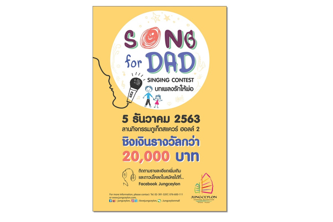 ศูนย์การค้าจังซีลอน ป่าตอง ภูเก็ต ขอเชิญชวนน้องๆ หนูๆ เยาวชนภาคใต้ทั้งชายและหญิง ที่มีอายุระหว่าง 7-18 ปี เข้าร่วมการประกวดร้องเพลง “บทเพลงรักให้พ่อ” Song for DAD Singing Contest ชิงเงินรางวัลมูลค่ารวมกว่า 20,000 บาท โดยมีวัตถุประสงค์เพื่อส่งเสริมให้เยาวชนได้ใช้เวลาว่างให้เกิดประโยชน์ ได้แสดงความสามารถออกมาอย่างสร้างสรรค์ และสนับสนุนส่งเสริมความรักความสัมพันธ์อันดีให้เกิดขึ้นภายในครอบครัว อันเป็นรากฐานสำคัญในการเติบโตอย่างมีคุณภาพ