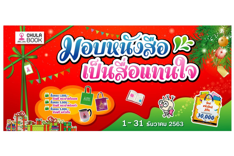 หนังสือเป็นของขวัญที่แสดงถึงการส่งต่อความปรารถนาดีไปยังผู้รับ หนังสือบางเล่มอาจช่วยส่งเสริมกำลังใจ หรืออาจเปลี่ยนชีวิตของผู้อ่านได้ ศูนย์หนังสือจุฬาลงกรณ์มหาวิทยาลัย ขอเชิญเป็นส่วนหนึ่งของการส่งความสุขในเทศกาลปีใหม่กับ เทศกาล “มอบหนังสือเป็นสื่อแทนใจ” ส่งความสุขให้คนที่คุณรักด้วยหนังสือหลากหลาย อาทิ หนังสือสวยงาม หนังสือส่งเสริมกำลังใจ หนังสือแนวสุขภาพ สมุดบันทึก ฯลฯ พร้อมบริการห่อของขวัญ ตลอดเดือนธันวาคม 2563 ณ ศูนย์หนังสือจุฬาฯ ทุกสาขา พร้อมรับของสมนาคุณ ตามเงื่อนไขที่ร่วมรายการ ... สอบถามรายละเอียดเพิ่มเติมได้ที่ แผนกประชาสัมพันธ์ ศูนย์หนังสือจุฬาฯ โทร. 0-2218-9894