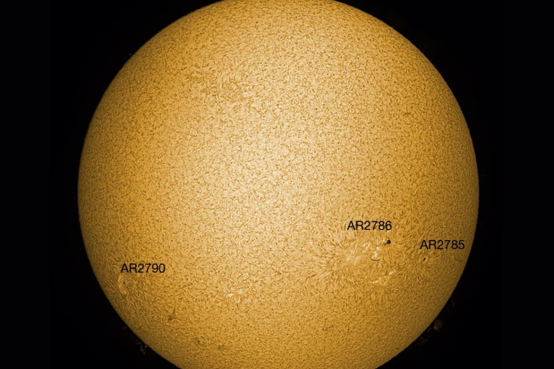 NARIT สถาบันวิจัยดาราศาสตร์แห่งชาติ โพสต์ผ่านเฟซบุ๊กระบุ “...ภาพถ่ายล่าสุดของดวงอาทิตย์ บันทึกภาพในช่วงคลื่นไฮโดรเจนอัลฟา เห็น #จุดบนดวงอาทิตย์ ชัดเจน