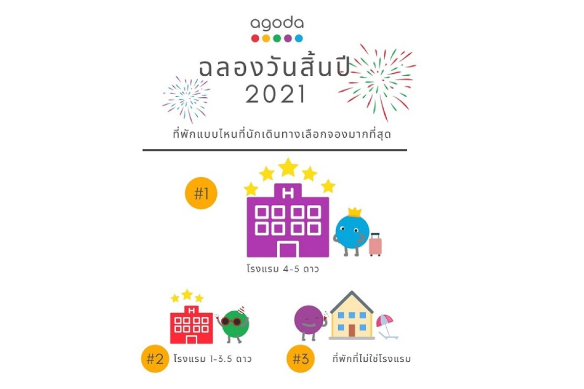 หลังจากต้องเดินทางท่องเที่ยวตามกฎข้อบังคับเกี่ยวกับการป้องกันโรคโควิด-19 มานานหลายเดือน นักเดินทางจึงเลือกวางแผนดื่มด่ำกับการฉลองส่งท้ายปีเก่า ต้อนรับปีใหม่แบบลักชูรี่กันมากขึ้น ซึ่งจากข้อมูลการจองห้องพักของอโกด้า เมื่อวันที่ 10 ธันวาคม 2020 สำหรับการจองห้องพักในวันสิ้นปี 2019 และวันสิ้นปี 2020 บนแพลตฟอร์มดิจิทัล พบว่าโรงแรม 4-5 ดาวเป็นตัวเลือกที่พักอันดับ 1 ของนักเดินทางทั่วโลกในวันสิ้นปี 2020 ส่วนโรงแรม 1-3.5 ดาวลงมาอยู่ในอันดับ 2 เมื่อเทียบกับวันสิ้นปี 2019