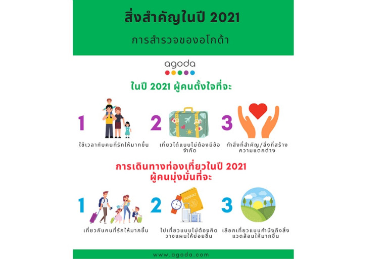จากการสำรวจ สิ่งสำคัญในปี 2021 ทั่วโลก ที่ อโกด้า แพลตฟอร์มดิจิทัลด้านการเดินทางท่องเที่ยวระดับโลก ได้สำรวจ พบว่า ปี 2021 จะเป็นปีที่ผู้คนให้ความสำคัญกับคนที่รัก และการสร้างความแตกต่างมากขึ้น โดยการใช้เวลาที่มีค่ากับคนที่รักมากขึ้น เป็นสิ่งที่ผู้คนตั้งใจที่จะทำมากที่สุด เป็น 1 ใน 3 ตามมาด้วยการเดินทางท่องเที่ยวแบบไม่มีข้อจำกัด 24% และการทำสิ่งที่สำคัญ/สิ่งที่สร้างความแตกต่าง ประมาณ 21%