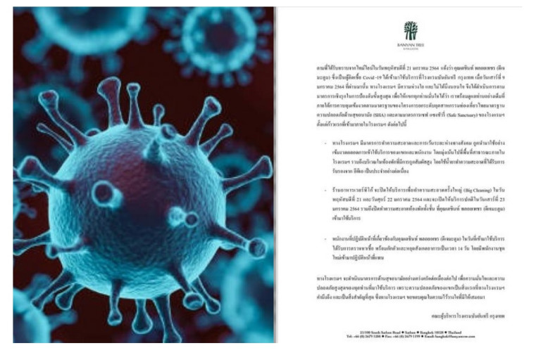 วันที่ 21 ม.ค. 2564 ผู้สื่อข่าวรายงาน ว่า ทางโรงแรมบันยันทรี กรุงเทพฯ ได้โพสต์ข้อความ ระบุว่า “ตามที่ได้รับทราบจากไทม์ไลน์ในวันพฤหัสบดีที่ 21 มกราคม 2564 แจ้งว่า คุณเตชินท์ พลอยเพชร (ดีเจมะตูม) ซึ่งเป็นผู้ติดเชื้อ Covid-19 ได้เข้ามาใช้บริการที่โรงแรมบันยันทรี กรุงเทพ เมื่อวันเสาร์ที่ 9 มกราคม 2564 ที่ผ่านมานั้น ทางโรงแรมๆ มีความห่วงใย และไม่ได้นิ่งนอนใจ จึงได้ดำเนินการตามมาตรการเชิงรุกในการป้องกันขั้นสูงสุด เพื่อให้แขกทุกท่านมั่นใจได้ว่า เราพร้อมดูแลท่านอย่างเต็มที่