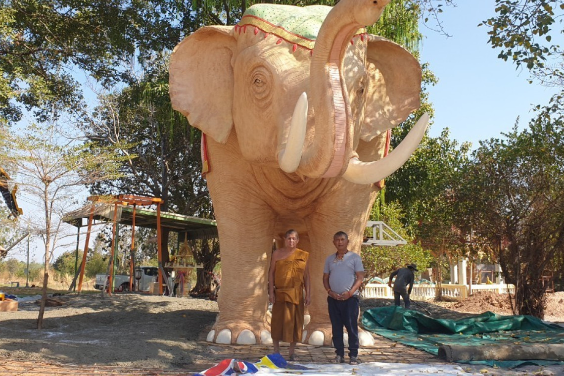 พระศิริวัฒน์ ถาวรธมฺโม เจ้าอาวาสวัดป่าคำหัวช้าง เล่าให้ฟังว่า ด้วยความเคารพศรัทธาของคนที่มาขอพร บนบานศาลกล่าวกับพ่อปู่คำหัวช้าง ณ สถานที่แห่งนี้ซึ่งเป็นเส้นทางเดินทัพของเหล่านักรบ ครานั้น ช้างศึกของน้องสาวย่าโมแห่งเมืองโคราชได้พลัดตกลงไปตายในหนองน้ำท้ายวัดในอดีต ภายหลังได้มีการพบโครงกระดูก จึงมีการปั้นรูปช้างขึ้นเพื่อระลึกถึงช้างเชือกดังกล่าว พร้อมตั้งชื่อว่า “พลายแก้วกระดิ่งทอง” โดยช้างพลายแก้วกระดิ่งทอง จะมีความสูง 5 เมตร ภายในตัวช้างมีวัตถุมงคลร้อยแปดบรรจุไว้ เพื่อความเป็นสิริมงคลต่อผู้เคารพกราบไหว้