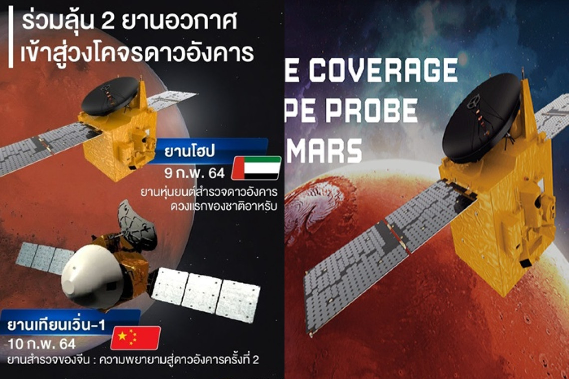 ยานความหวังลำแรกขกับภารกิจศึกษาชั้นบรรยากาศ ขณะ 10 ก.พ. ในช่วงเวลาเดียวกัน ยานเทียนเวิ่น 1 ของจีน ที่เป็นความพยายามครั้งที่ 2 กับภารกิจลงจอดสำรวจพื้นผิว