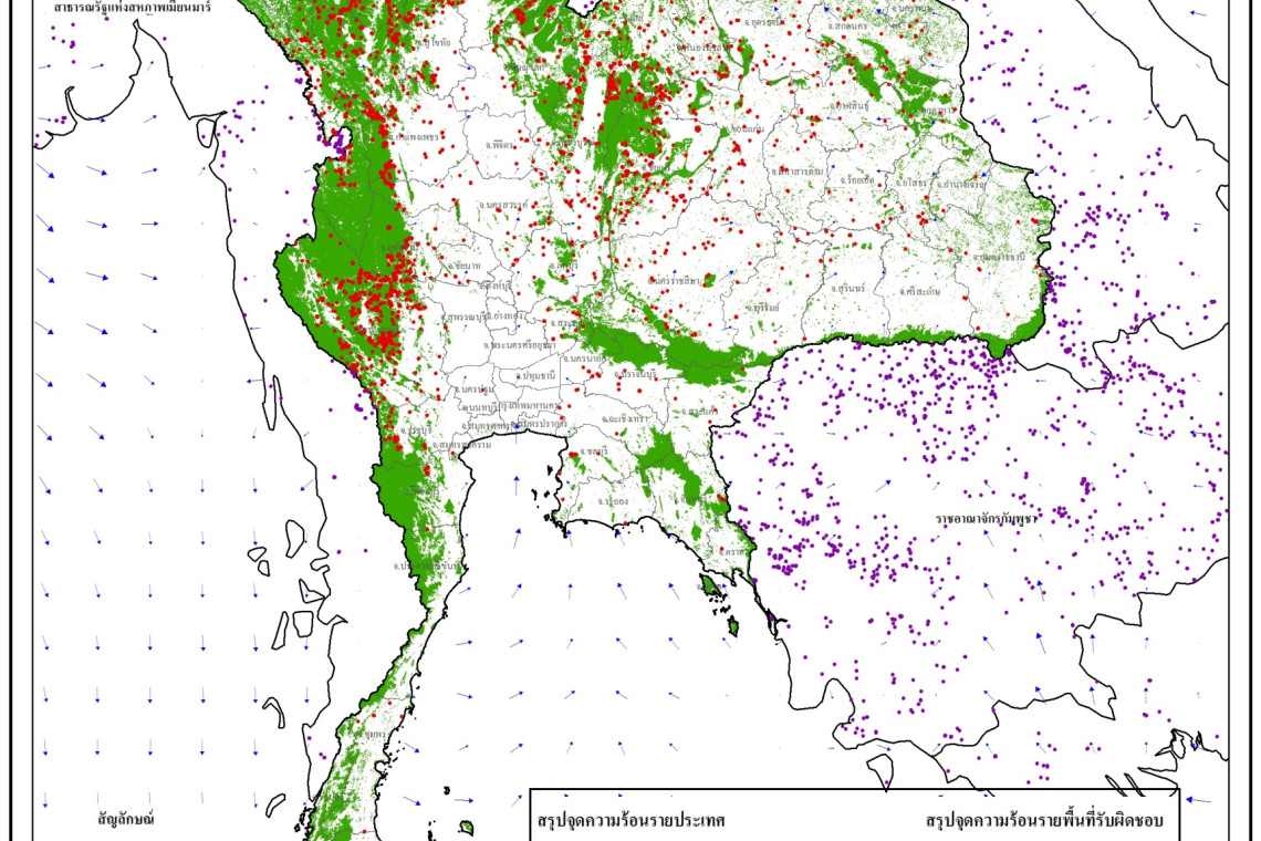 ข้อมูลภาพจากดาวเทียม พบว่าจุดความร้อนที่เกิดขึ้นมีการจุกตัวอยู่ในพื้นที่ภาคเหนือและภาคตะวันตก โดยจังหวัดกาญจนบุรี พบจุดความร้อนมากที่สุด 646 จุด รองลงมาเป็นจังหวัดลำปาง 465 จุด และจังหวัดตาก 344 จุด ตามลำดับ ส่วนใหญ่เกิดขึ้นในพื้นที่ป่าอนุรักษ์ พื้นที่ป่าสงวนแห่งชาติ และพื้นที่เกษตรตามลำดับ เบื้องต้นคาดว่าเกิดจากการบริหารจัดการเชื้อเพลิงในพื้นที่และเตรียมพื้นที่เพื่อการเกษตร