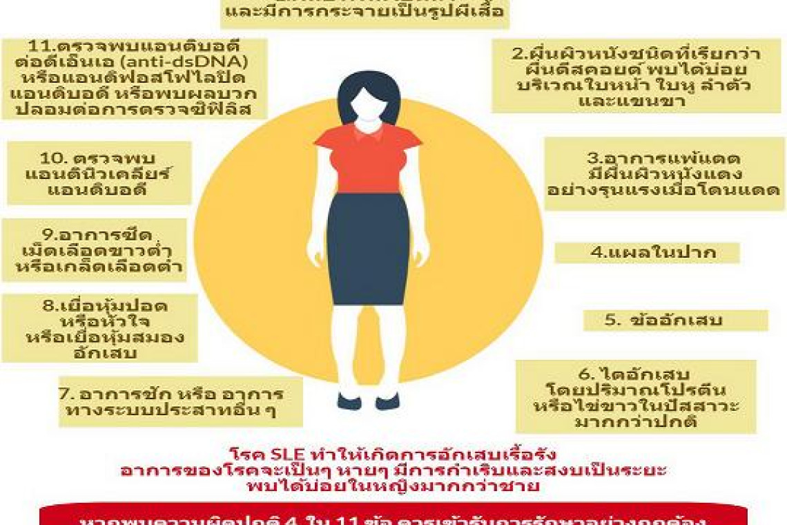 นพ.ธีรพล โตพันธานนท์ อธิบดีกรมการแพทย์ เปิดเผยว่า โรคแพ้ภูมิตัวเอง หรือโรค SLE (Systemic Lupus Erythematosus, SLE) เป็นโรคภูมิต้านทานตนเองทำลายเนื้อเยื่อตัวเอง ทำให้อักเสบเรื้อรัง จะเป็นๆ หายๆ กำเริบและสงบเป็นระยะ พบในหญิงมากกว่าชาย สาเหตุไม่ทราบแน่ชัด แต่มีปัจจัยทางพันธุกรรม และปัจจัยอื่น ได้แก่ ติดเชื้อ ยา แสงแดด สารเคมีในสิ่งแวดล้อม จะแสดงความผิดปกติในร่างกายหลายระบบร่วมกัน เช่น ผื่นโรคSLEระบบผิวหนัง ประสาท หัวใจ-หลอดเลือด กล้ามเนื้อและข้อ เม็ดเลือด ไต ระบบทางเดินหายใจ ผมร่วง เป็นต้น
