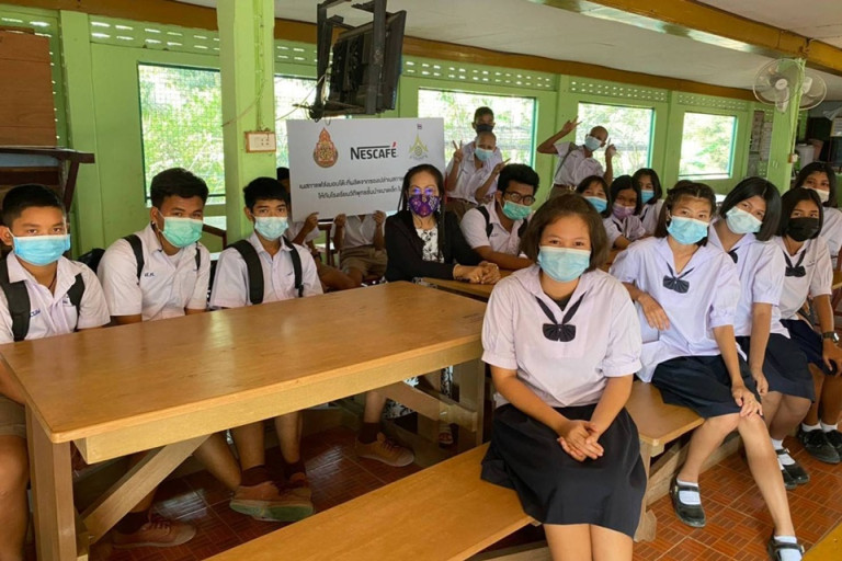 “นอกจากซองกาแฟที่เป็นมิตรต่อสิ่งแวดล้อมแล้ว เราได้ดำเนินโครงการ “เนสกาแฟ อัพไซคลิ่ง” (NESCAFÉ Upcycling) ในการนำซองเปล่าเนสกาแฟ เบลนด์ แอนด์ บรู จำนวนกว่า 16 ล้านซอง หรือกว่า 16 ตันที่ได้จากการส่งชิงโชคจากผู้บริโภค มาใช้ให้เกิดประโยชน์และสร้างมูลค่าเพิ่ม โดยจับมือกับบริษัท เบสท์โพลิเมอร์ ในการคิดค้นนวัตกรรมอัพไซคลิ่งซองเนสกาแฟให้เป็นไม้เทียม (Wood Plastic Composite) ผลิตชุดโต๊ะรับประทานอาหารพร้อมเก้าอี้สำหรับโรงอาหารในโรงเรียน เพื่อมอบให้กับโรงเรียนวิถีพุทธ 100 โรงเรียนทั่วประเทศ โรงเรียนละ 2 ชุด เราหวังเป็นอย่างยิ่งว่า ชุดโต๊ะรับประทานอาหารพร้อมเก้าอี้อัพไซคลิ่งจากซองเนสกาแฟเหล่านี้ จะเป็นกำลังใจและปลูกฝังนิสัยในการลดปริมาณขยะให้แก่น้องๆ ในโรงเรียนวิถีพุทธ เพื่อสร้างอนาคตปลอดขยะอย่างยั่งยืน”