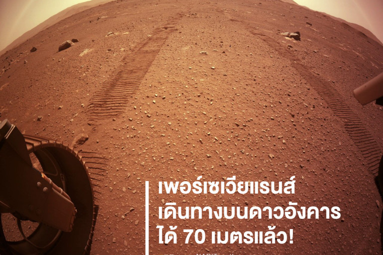 NARIT สถาบันวิจัยดาราศาสตร์แห่งชาติ โพสต์ผ่านเฟซบุ๊ก ระบุ “NASA เผยภาพรอยล้อของ #รถสำรวจเพอร์เซเวียแรนส์ บนพื้นผิวดาวอังคาร ขณะนี้ยานกำลังตามหาพื้นที่สำหรับทดสอบการบินของเฮลิคอปเตอร์น้อย #อินเจนูอิตี และเดินทางมาได้ 70 เมตรแล้ว หลังจากเคลื่อนตัวครั้งแรกในวันที่ 6 มีนาคมที่ผ่านมา