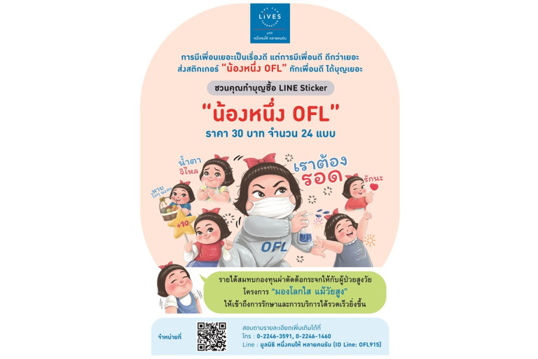 มูลนิธิหนึ่งคนให้ หลายคนรับ (One For Lives Foundation) ขอเชิญทุกท่านร่วมทำบุญผ่านการซื้อ Line Sticker “น้องหนึ่ง OFL” ราคา 30 บาท (จำนวน 24 แบบ) โดยรายได้หลังหักค่าใช้จ่ายสมทบกองทุนผ่าตัดต้อกระจกให้กับผู้ป่วยสูงวัยในโครงการ “มองโลกใส แม้วัยสูง” ให้เข้าถึงการรักษาและการบริการได้รวดเร็วยิ่งขึ้น รวมทั้งลดภาวะตาบอดจากต้อกระจก สามารถร่วมทำบุญได้ที่ Line Sticker Shop พิมพ์ Nong Nueng OFL หรือ https://line.me/S/shop/sticker/author/2071103 สอบถามรายละเอียดเพิ่มเติมโทร 0-2246-3951, 0-2246-1460
