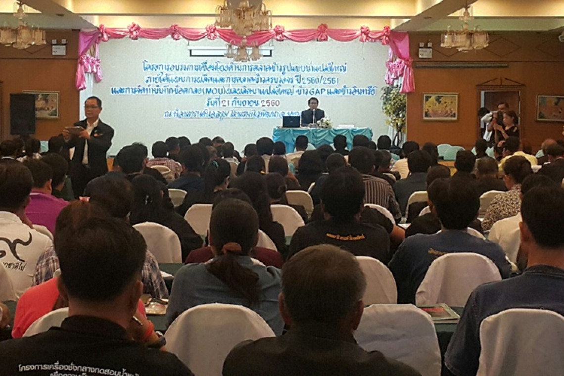 วันนี้ ( 21 ก.ย.60) กรมส่งเสริมสหกรณ์ โดยสำนักงานสหกรณ์จังหวัดมหาสารคาม ดำเนินการจัดโครงการอบรมเชื่อมโยงด้านการตลาดข้าวนาแปลงใหญ่ ภายใต้แผนการผลิตและการตลาดข้าวครบวงจร ปี 2560/2561 และการจัดทำบันทึกข้อตกลง (MOU) ผลผลิตนาแปลงใหญ่ ข้าว GAP และข้าวอินทรีย์ ระหว่าง สหกรณ์ผู้ผลิตข้าวนาแปลงใหญ่ในจังหวัดมหาสารคาม 45 แปลง และผู้แทนโรงสีข้าว 11 แห่ง ณ โรงแรมนิวพัฒนา จังหวัดมหาสารคาม