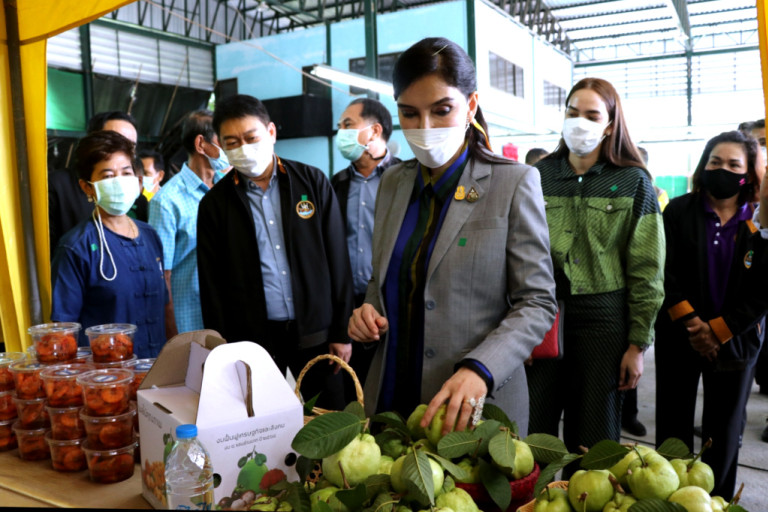 จากนั้น ได้เยี่ยมชมบูธจัดแสดงสินค้าทางการเกษตรของสหกรณ์กลุ่มเกษตรกร และพบปะเกษตรกรรุ่นใหม่ที่เข้าร่วมโครงการนำลูกหลานเกษตรกรกลับบ้าน สานต่ออาชีพทางการเกษตร ในพื้นที่จังหวัดนครศรีธรรมราช จำนวน 6 ราย นำโดย นางสาวโศภิษฐ์ ท่องแก้ว เกษตรกรรุ่นใหม่ที่เข้าร่วมโครงการฯ ได้นำผลผลิตทางการเกษตรของตนเองมาร่วมจัดแสดงและจำหน่าย ได้แก่ น้ำส้มควันไม้ ถ่านไบโอชาบำรุงดินและพืช จุลินทรีย์สังเคราะห์แสง นางสาวพวงเพ็ญ จันทร์งาม นำผลผลิตทางการเกษตร พริก ฝรั่งกิมจู ส้มโอทับทิมสยาม มาร่วมจัดแสดงและจำหน่าย นอกจากนี้ ยังมีผลิตภัณฑ์ทางการเกษตรอื่น ๆ อาทิ น้ำนมแพะ ข้าวสังข์หยด ไข่เป็ด ผักปลอดภัย ผลิตภัณฑ์จากโกโก้ สละ และน้ำหมักอินทรีย์ เป็นต้น