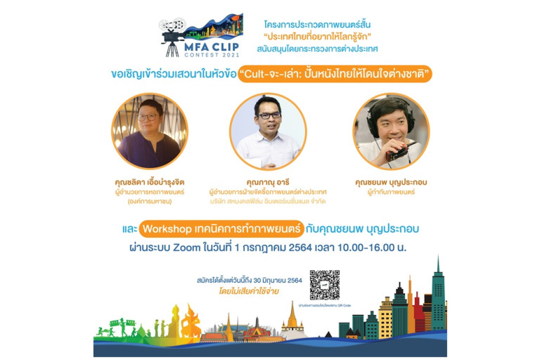 กรมสารนิเทศ กระทรวงการต่างประเทศ เชิญนักสร้างสรรค์ที่ชื่นชอบการผลิตหนังสั้น เข้าร่วมกิจกรรมเสวนาหัวข้อ “Cult-จะ-เล่า : ปั้นหนังไทยให้โดนใจต่างชาติ” โดยวิทยากรผู้ทรงคุณวุฒิ ได้แก่ คุณชลิดา เอื้อบำรุงจิต ผู้อำนวยการหอภาพยนตร์ (องค์กรมหาชน) คุณภาณุ อารี ผู้อำนวยการฝ่ายจัดซื้อภาพยนตร์ต่างประเทศ บริษัท สหมงคลฟิล์ม อินเตอร์เนชั่นแนล จำกัด พร้อมด้วย คุณชยนพ บุญประกอบ ผู้กำกับภาพยนตร์ชื่อดัง ที่จะมาเปิดมุมมอง มอบความรู้ เทคนิคการผลิต และการตัดต่อหนังสั้นอย่างมืออาชีพ ผ่านระบบ Zoom ในวันที่ 1 กรกฎาคม 2564 เวลา 10.00 - 16.00 น. โดยไม่เสียค่าใช้จ่าย