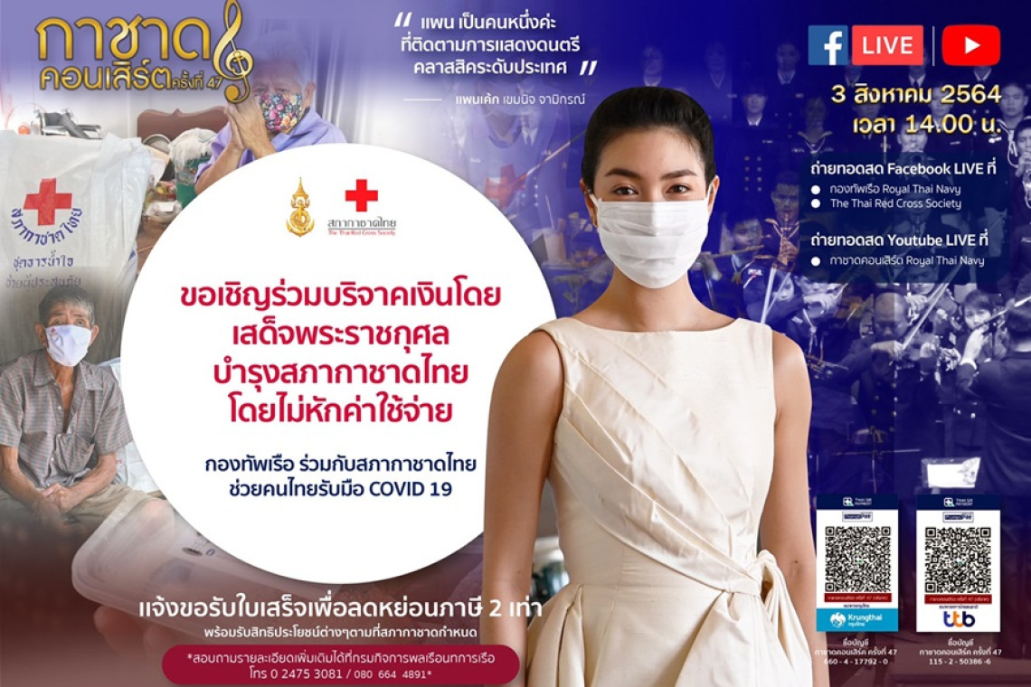 โดยกำหนดจัดการแสดงกาชาดคอนเสิร์ต ครั้งที่ 47 ในวันอังคารที่ 3 สิงหาคม 2564 เวลา 14.00 น. ผ่านการถ่ายทอดสดทางเฟซบุ๊กแฟนเพจ กองทัพเรือ Royal Thai Navy เฟซบุ๊กแฟนเพจ The Thai Red Cross Society และ YoutubeLive กาชาดคอนเสิร์ต Royal Thai Navy เพื่อหารายได้โดยไม่หักค่าใช้จ่ายทูลเกล้าถวายสมเด็จพระนางเจ้าสิริกิติ์ พระบรมราชินีนาถ พระบรมราชชนนีพันปีหลวง โดยเสด็จพระราชกุศลบำรุงสภากาชาดไทย อันเป็นการสนองในพระราชปณิธานของสมเด็จพระนางเจ้าสิริกิติ์ พระบรมราชินีนาถ พระบรมราชชนนีพันปีหลวง องค์สภานายิกาสภากาชาดไทย ที่จะให้การช่วยเหลือรักษาพยาบาลเพื่อนมนุษย์ผู้เจ็บป่วยทั้งมวลให้ได้อยู่ร่วมกันอย่างสันติสุข อีกทั้งเป็นการเผยแพร่ดนตรีแนวคลาสสิกให้เป็นที่แพร่หลายในหมู่ประชาชนชาวไทย ซึ่งกองทัพเรือก็ได้ดำเนินการตามพระราชปณิธาน ตั้งแต่ปี 2504 เป็นต้นมา โดยใช้ชื่อการแสดงว่า “กาชาดคอนเสิร์ต” และได้จัดแสดงเป็นประจำทุกปี จะมีเว้นบ้างตามสถานการณ์ที่ไม่เอื้ออำนวย โดยวงดุริยางค์ราชนาวี นับได้ว่าเป็นวงซิมโฟนีออเคสตร้าแนวคลาสสิกชั้นนำวงหนึ่งของประเทศไทยที่ได้รับความนิยมและประสบความสำเร็จอย่างสูง ได้มีโอกาสบรรเลงในงานพระราชพิธี รัฐพิธี ตลอดจนงานสำคัญต่างๆ อยู่เป็นประจำ