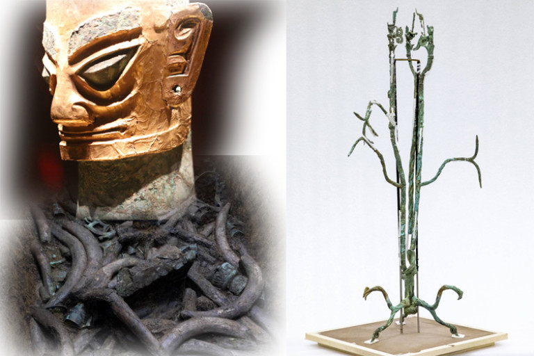 เกา ต้าหลุน: เครื่องสำริดที่ขุดพบจากหลุมบวงสรวงซานซิงตุยไม่เพียงแต่มีจำนวนมากเท่านั้น หากยังมีจำนวนไม่น้อยที่มีขนาดใหญ่ รูปทรงแปลกตา และมีความซับซ้อนในงานฝีมืออีกด้วย ตัวอย่างเช่น มีรูปปั้นคนท่ายืนที่สูงที่สุดในยุคสำริดซึ่งมีความสูงถึง 2.62 เมตร มีต้นไม้ศักดิ์สิทธิ์ที่สูงและใหญ่ที่สุดในยุคสำริดซึ่งมีความสูงถึง 3.95 เมตร ยังมีแท่นบูชาศักดิ์สิทธิ์ที่มีรูปทรงแปลกประหลาดที่สุด ซึ่งบนตัวแท่นมีรูปปั้นนูนสูงคนและสัตว์ 22 รูป ซึ่งมีความสูงประมาณ 53 เซนติเมตร เครื่องสำริดเหล่านี้ถือได้ว่าเป็นภาพสะท้อนที่เป็นรูปธรรมของทัศนคติต่อชีวิต ค่านิยมและโลกทัศน์ของชาวก๊กสู่โบราณ