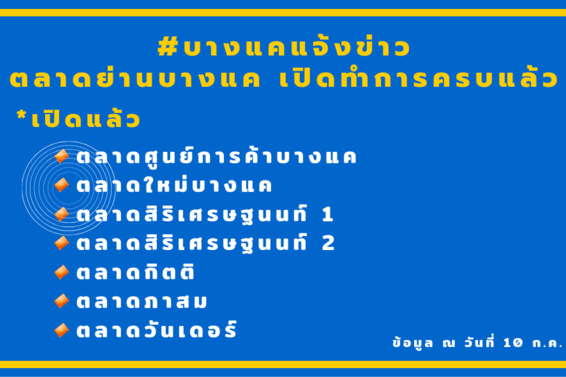 สำนักงานเขตบางแค แจ้งว่า สืบเนื่องจากที่ สำนักงานเขตบางแค ได้พิจารณาปิดตลาดในย่านบางแค เป็นเวลา 14 วัน เพื่อฆ่าเชื้อทำความสะอาด รวบรวมผลการตรวจและปรับปรุงสุขาภิบาลในตลาดให้เป็นไปตามมาตรฐานนั้น เมื่อวันที่ 10 ก.ค. 64 ที่ผ่านมา ตลาดในย่านบางแค ทั้ง 6 ตลาด ได้ปรับปรุง และปิดครบตามกำหนด สามารถเปิดให้บริการได้ครบทั้ง 6 ตลาดเรียบร้อยแล้ว
