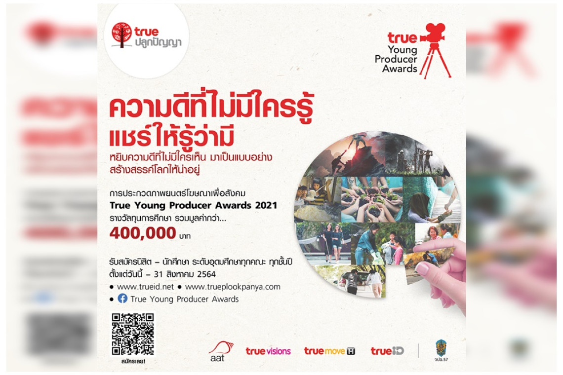 ทรูปลูกปัญญา ร่วมกับ สมาคมโฆษณาแห่งประเทศไทย พร้อมด้วยทรูวิชั่นส์ ทรูไอดี และทรูมูฟเอช เชิญชวนเยาวชนไทยค้นหาเรื่องราวการทำความดี ไม่ว่าจะเป็นเรื่องเล็ก หรือเรื่องใหญ่ มาปั้นให้เป็นภาพยนตร์โฆษณา เพื่อส่งต่อให้สังคมได้รับรู้ สร้างการเปลี่ยนแปลงให้กับสังคม พร้อมเชิดชูความดีให้คนอยากทำความดีมากยิ่งขึ้น ในโครงการประกวดภาพยนตร์โฆษณาเพื่อสังคม True Young Producer Awards 2021 ครั้งที่ 17 ถ้วยพระราชทานสมเด็จพระกนิษฐาธิราชเจ้า กรมสมเด็จพระเทพรัตนราชสุดา ฯ สยามบรมราชกุมารี ในหัวข้อ ‘ความดีที่ไม่มีใครรู้ แชร์ให้รู้ว่ามี’ ชิงทุนการศึกษา รวมมูลค่ากว่า 400,000 บาท