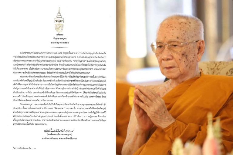 วันอาสาฬหบูชา นอกจากจะเตือนใจให้รำลึกถึงคุณพระรัตนตรัย อันเป็นสรณะสูงสุดของพุทธบริษัทแล้ว ยังนำพาให้เราทั้งหลายมั่นคงแน่วแน่ด้วยปณิธานแห่ง “สัมมาวาจา” เพราะฉะนั้น หากท่านประสงค์ให้สังคมไทยไพบูลย์ด้วยสันติสุข ขอจงเร่งเจริญรอยตามพระยุคลบาทของพระพุทธองค์ ผู้ทรงพระมหากรุณาประทานอริยอัฏฐังคิกมรรคไว้เป็นหนทาง พร้อมเพรียงกันบำเพ็ญคุณประโยชน์ โดยเริ่มที่ตนเอง จากการมี “สัมมาวาจา” อยู่ทุกขณะ ซึ่งจะช่วยเกื้อกูลให้เพื่อนร่วมชาติ ร่วมสังคม สามารถก้าวข้ามพ้นจากความทุกขโทมนัส แปรเปลี่ยนเป็นความเกษมสวัสดิ์ของสรรพชีวิตบนโลกนี้ได้สืบไป ตลอดกาลนาน