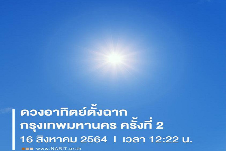 เพจ NARIT สถาบันวิจัยดาราศาสตร์แห่งชาติ โพสต์ผ่านเฟซบุ๊กระบุ #ดวงอาทิตย์ตั้งฉากกรุงเทพมหานคร ครั้งที่ 2 วันนี้ 16 สิงหาคม 2464 เวลา 12:22 น.