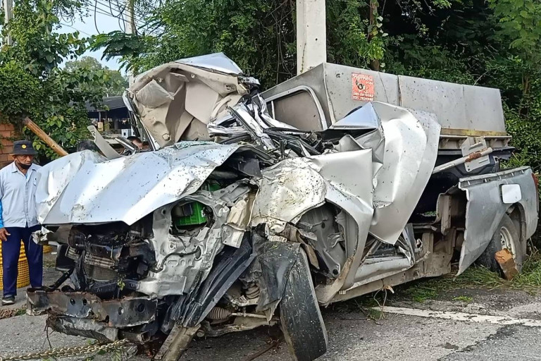 นึกว่าตาย ชาวบ้านได้ยินเสียงรถชนดังสนั่น พบซากกระบะพังยับติดเสาไฟฟ้า เจ้าหน้าที่เร่งช่วยงัดร่างออกจากรถพบแค่เจ็บเล็กน้อย เจ้าตัวเชื่อบารมีเหรียญหลวงปู่แผ้ว รุ่นแรกสร้างวัดกำแพงแสน ทำรอดตายปาฏิหาริย์ แต่หลุดหายในที่เกิดเหตุ